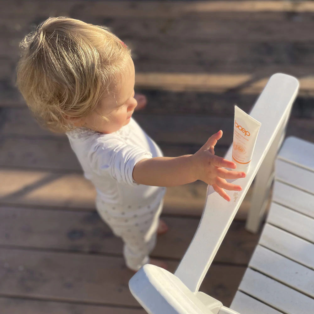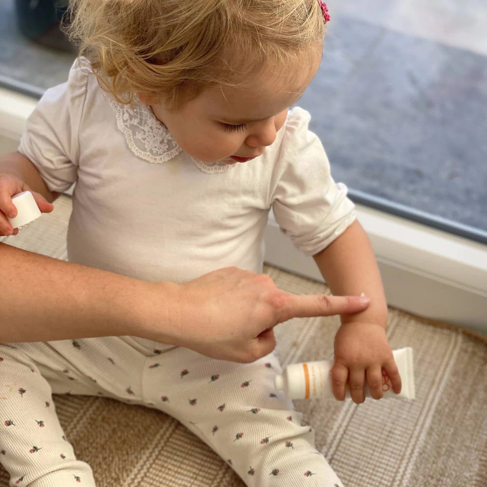 無香料のSPF50、PA++++の敏感肌用日焼け止めクリーム。お顔を含めた特に敏感肌の赤ちゃん、子供、大人の肌を強い日差しから保護します。
